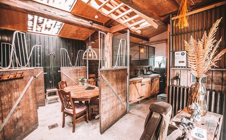 De leefruimte biedt een plek om te dineren onder het oude gebint van de paardenstal. Vanaf hier kijk je uit over de weiden en landerijen.